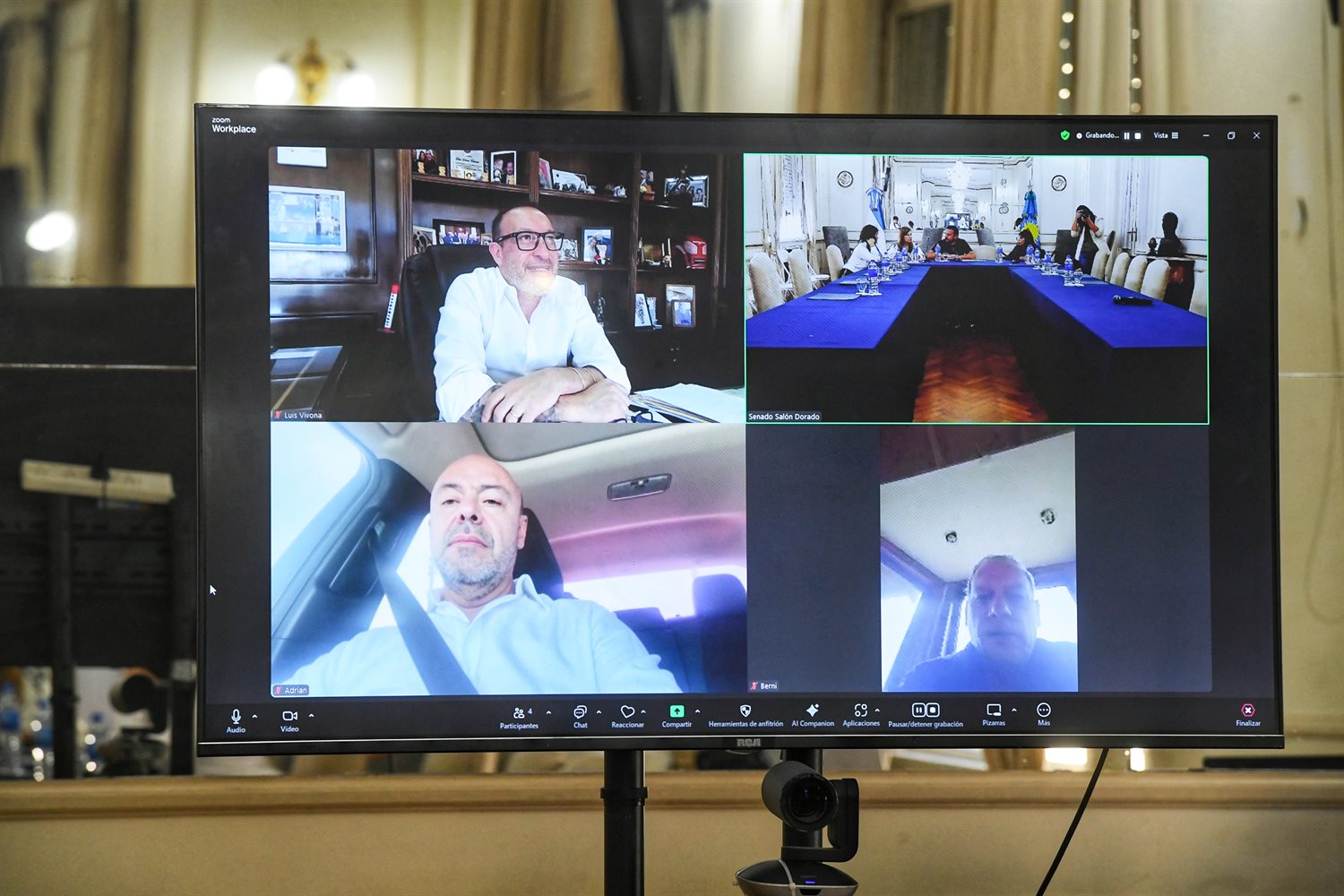 De manera remota, siguieron las implicancias del cónclave el vicepresidente Primero del Senado, Luis Vivona y los legisladores de Unión por la Patria Sergio Berni y Adrián Santarelli.