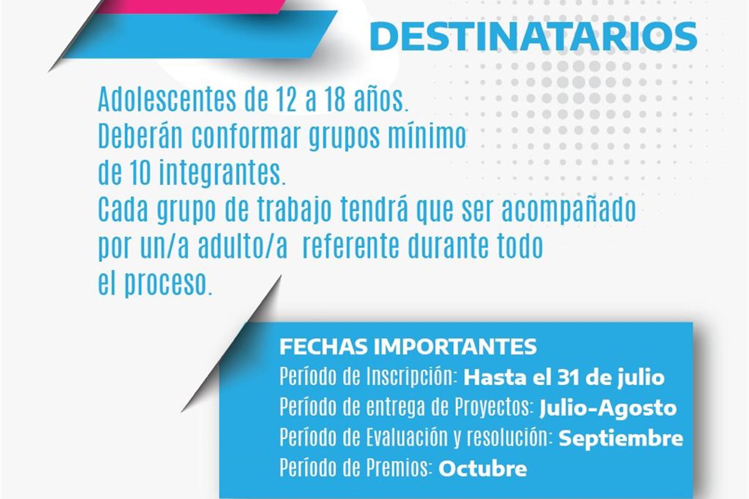 La evaluación de los proyectos se establecerá en dos grupos etarios: de 12 a 15 años y de 16 a 18 años, teniendo cada equipo un mínimo de 10 integrantes y siendo acompañados por un adulto referente durante todo el proceso de trabajo.
