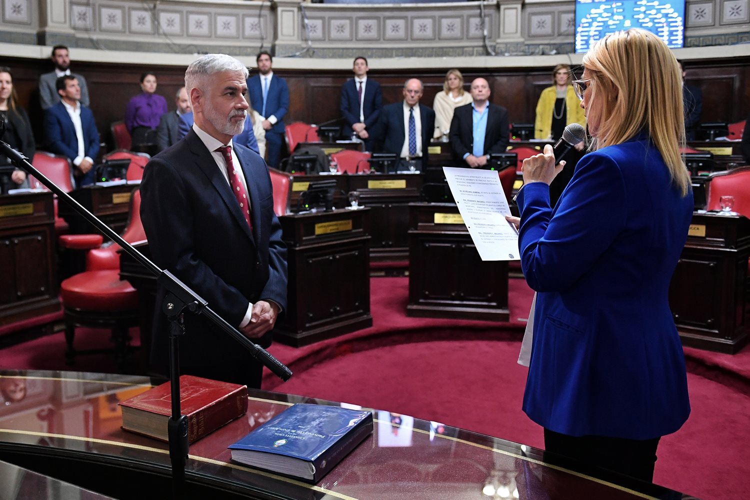 La vicegobernadora y presidenta del Cuerpo, Verónica Magario, le tomó juramento al nuevo secretario, quien posteriormente tomó su lugar en el estrado.